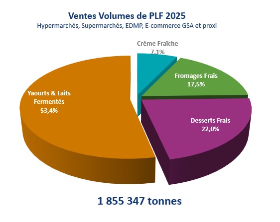 Les ventes de produits laitiers frais en Grande Distribution ont progressé de 1,9% en volume et de 2,4% en valeur en 2025 par rapport à 2024. Elles dépassent de nouveau leurs volumes de 2019, année de référence.