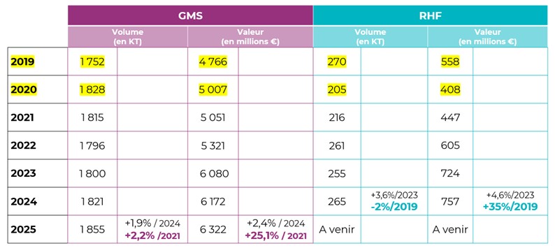 Le marché de la RHF poursuit sa reconstruction en 2024 pour retrouver des volumes comparables à 2019. Ils ont atteint 265 000 tonnes, en progression de 3,6% en volume.